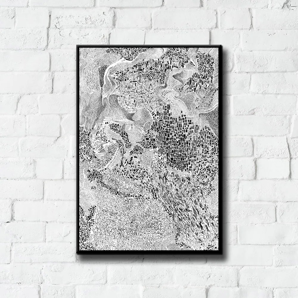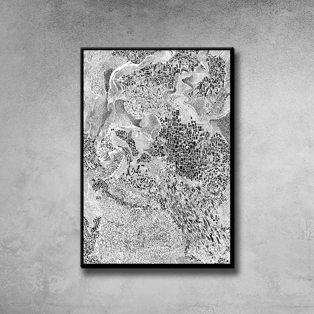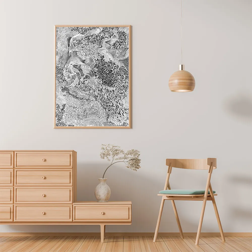 Plakat City jest reprodukcją grafiki autorstwa Adama Zientary. Inspiracją do powstania grafiki była struktura mchu widziana w skali makro. Obserwator może dostrzec zurbanizowaną strukturę miasta, przedzieloną górami, wyraźnie zaznaczone centrum i przylegające dzielnice. Abstrakcja jest czarnobiała i idealnie komponuje się w nowoczesnych wnętrzach, utrzymanych w stylu industrialnym.