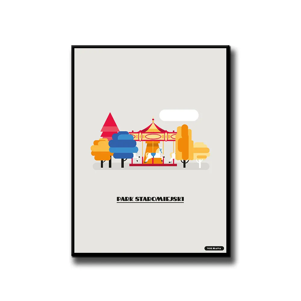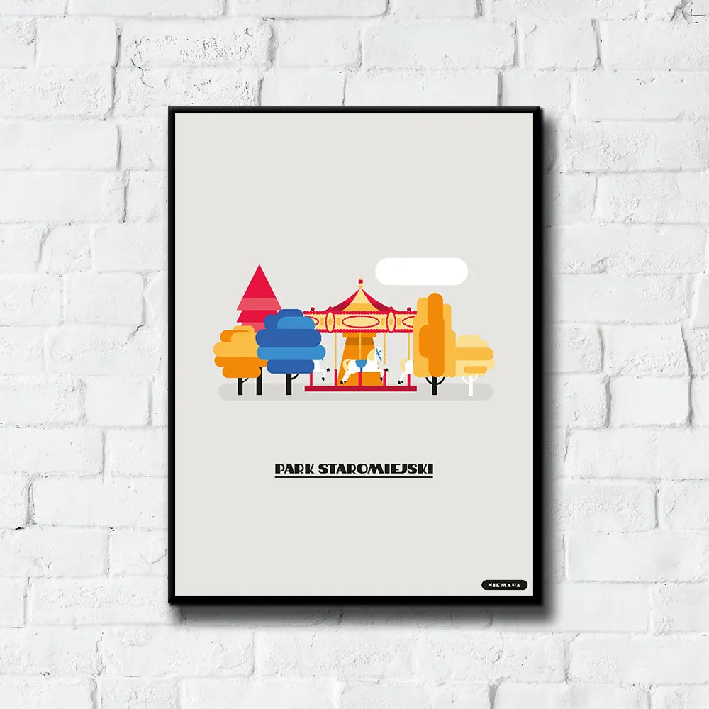 Plakat Park Staromiejski grupy NIEMAPA to inne spojrzenie na Twoje miasto i otaczającą Cię okolicę. Przyjemna kreska, kształty i kolory sprawiają, że plakat od razu rzuca się w oczy i nie przechodzisz obok niego obojętnie. Znajdziesz tu charakterystyczne miejsca Twojej okolicy, przedstawione w nieco inny, taki NIEMAPowy sposób.