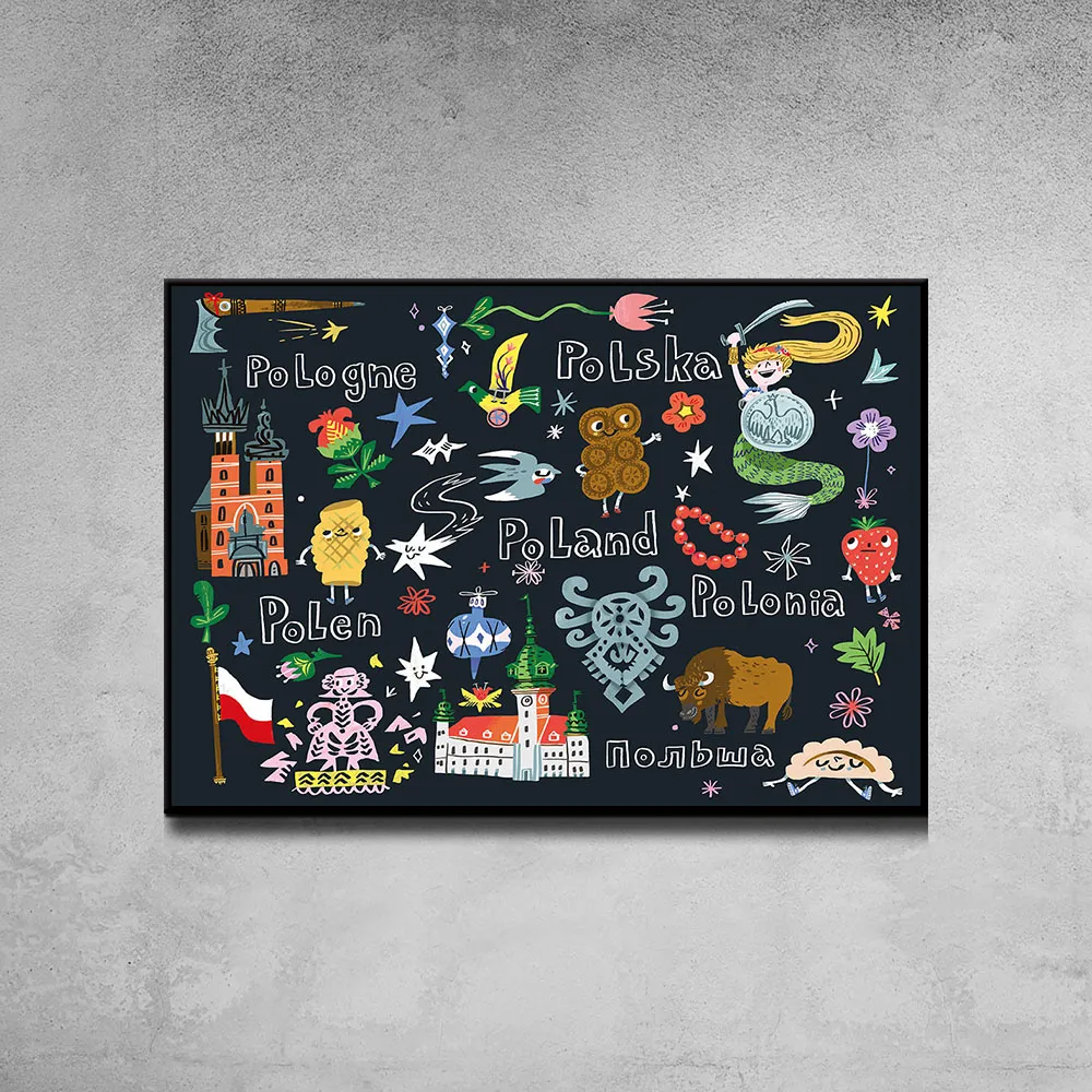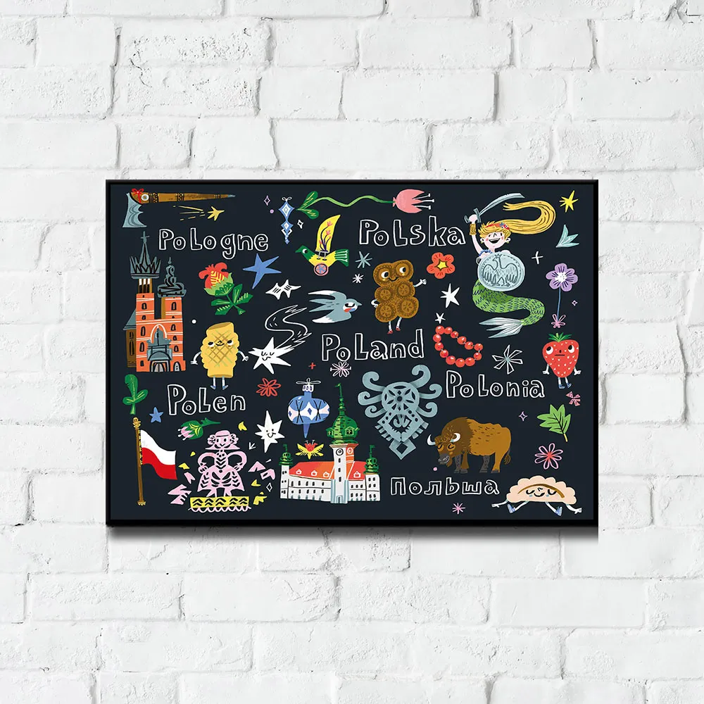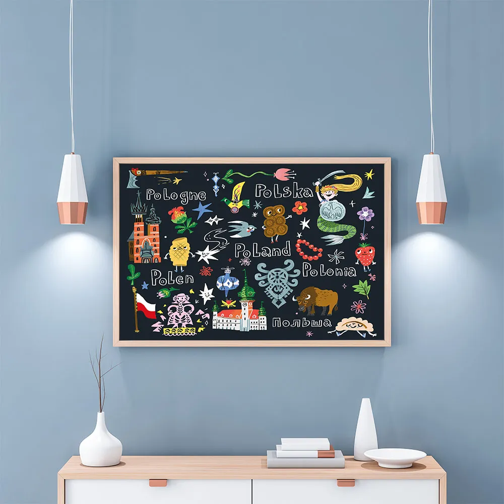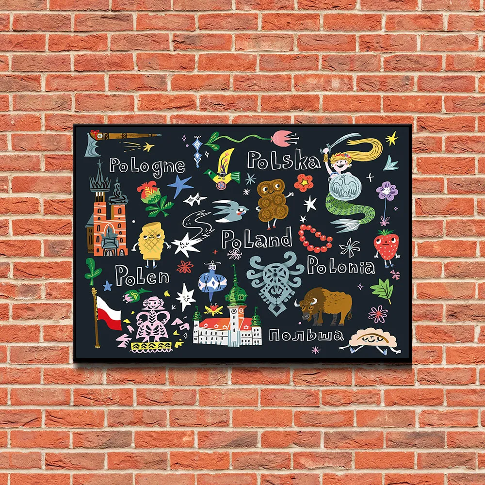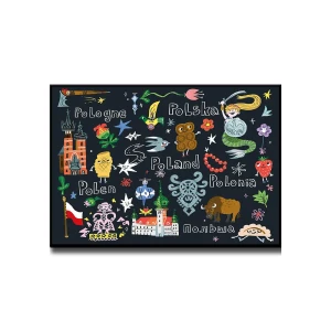 Plakat Pocztówka z Polski od grupy NIEMAPA. Odkryj bogactwo polskiej kultury z naszym kolorowym plakatem! To fascynująca podróż przez świat polskich symboli. Znajdziesz tu zabytki, które zachwycają swoją historią, rośliny i zwierzęta, które tworzą unikalny krajobraz Polski, oraz przepyszne potrawy, które rozpieszczą Twoje podniebienie. A wszystko to przedstawione w kilku językach świata! Czy rozpoznasz wszystkie ukryte detale? Plakat to również piękna dekoracja, która wprowadzi do Twojego domu odrobinę polskiej magii. Podaruj go bliskiej osobie i podziel się z nią swoją miłością do naszego kraju