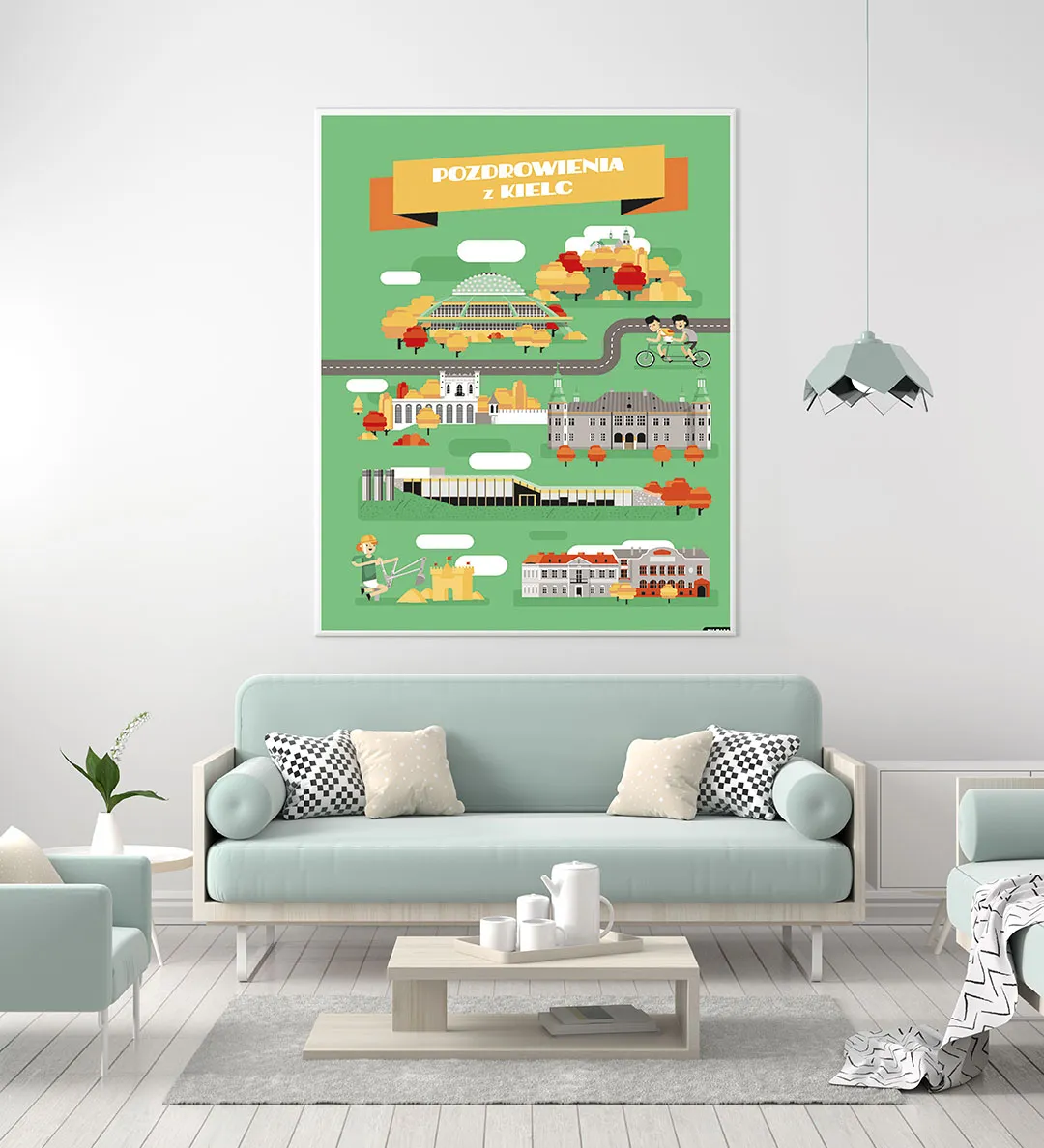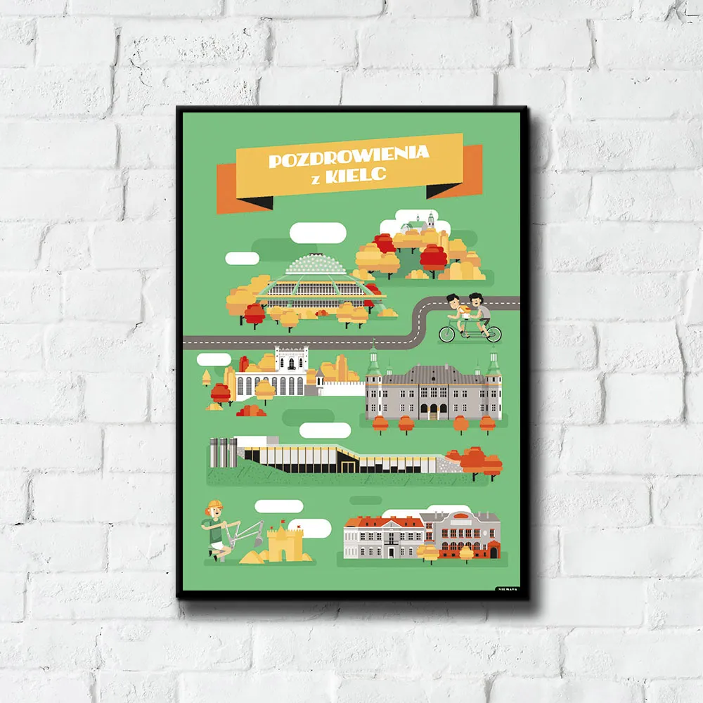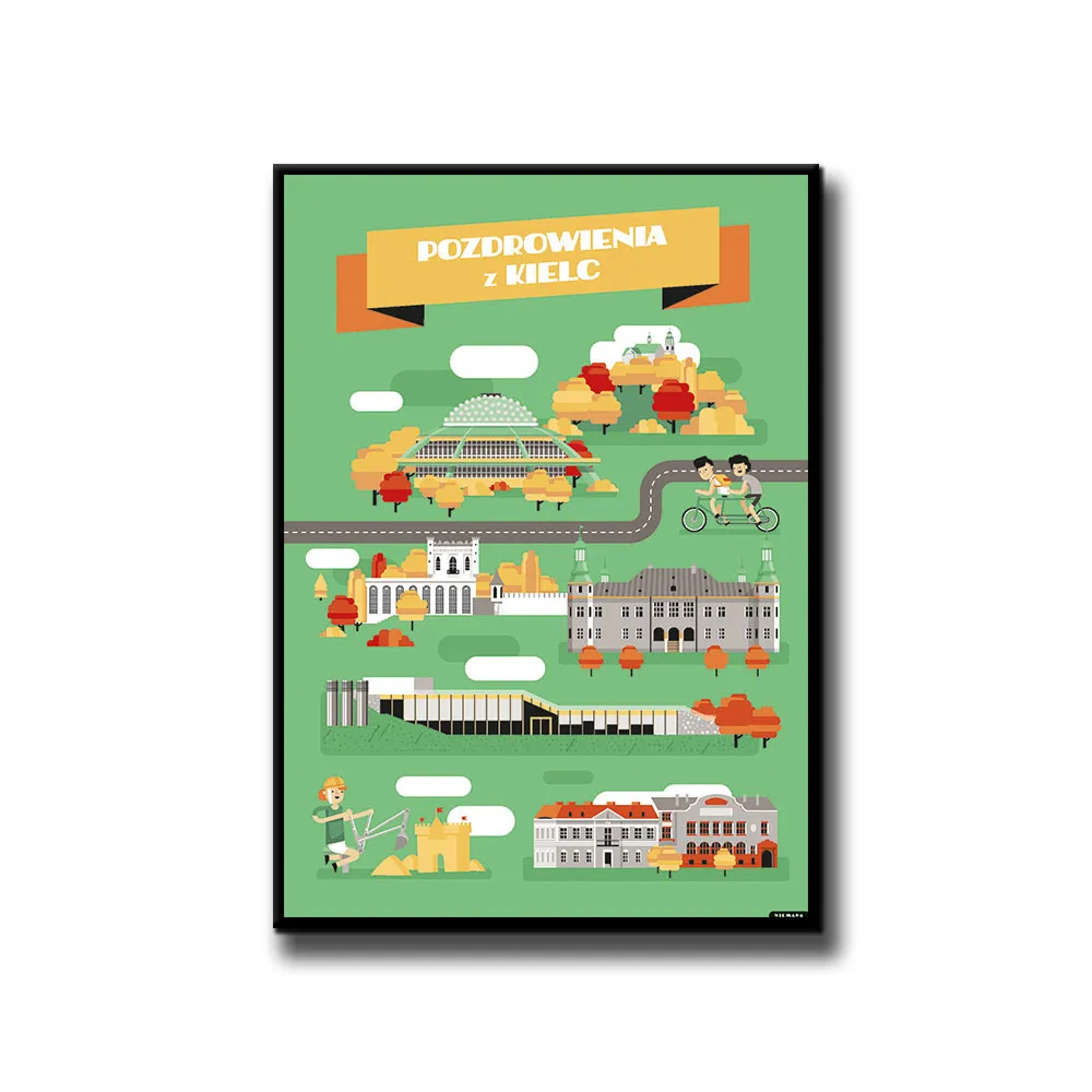 Plakat Pozdrowienia z Kielc grupy NIEMAPA to inne spojrzenie na Twoje miasto i otaczającą Cię okolicę. Przyjemna kreska, kształty i kolory sprawiają, że plakat od razu rzuca się w oczy i nie przechodzisz obok niego obojętnie. Znajdziesz tu charakterystyczne miejsca Twojej okolicy, przedstawione w nieco inny, taki NIEMAPowy sposób.