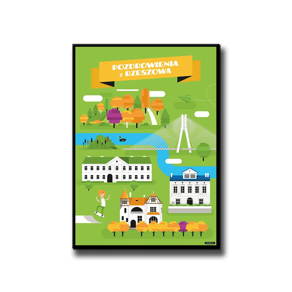 Plakat Pozdrowienia z Rzeszowa grupy NIEMAPA to inne spojrzenie na Twój region i otaczającą Cię okolicę. Przyjemna kreska, kształty i kolory sprawiają, że plakat od razu rzuca się w oczy i nie przechodzisz obok niego obojętnie. Znajdziesz tu charakterystyczne miejsca Twojej okolicy, przedstawione w nieco inny, taki NIEMAPowy sposób.