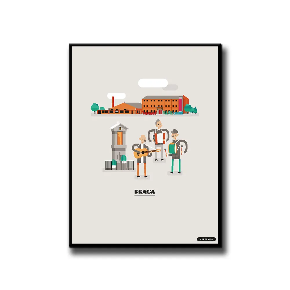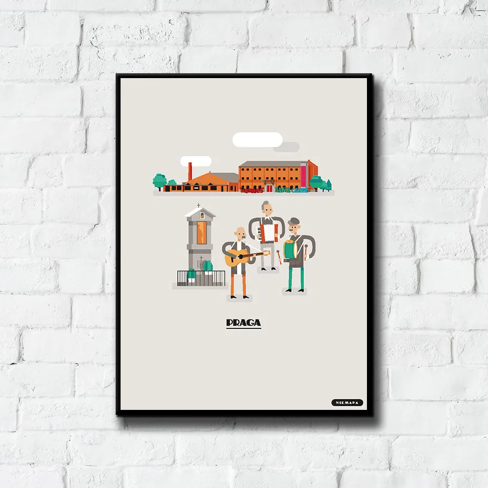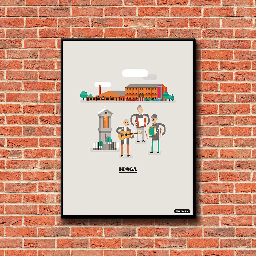 Plakat Praga grupy NIEMAPA to inne spojrzenie na Twoje miasto i otaczającą Cię okolicę. Przyjemna kreska, kształty i kolory sprawiają, że plakat od razu rzuca się w oczy i nie przechodzisz obok niego obojętnie. Znajdziesz tu charakterystyczne miejsca Twojej okolicy, przedstawione w nieco inny, taki NIEMAPowy sposób.