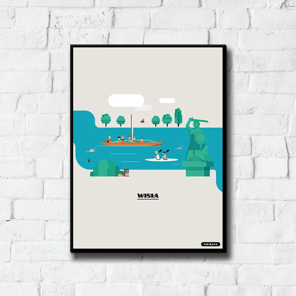 Plakat Wisła grupy NIEMAPA to inne spojrzenie na Twoje miasto i otaczającą Cię okolicę. Przyjemna kreska, kształty i kolory sprawiają, że plakat od razu rzuca się w oczy i nie przechodzisz obok niego obojętnie. Znajdziesz tu charakterystyczne miejsca Twojej okolicy, przedstawione w nieco inny, taki NIEMAPowy sposób.