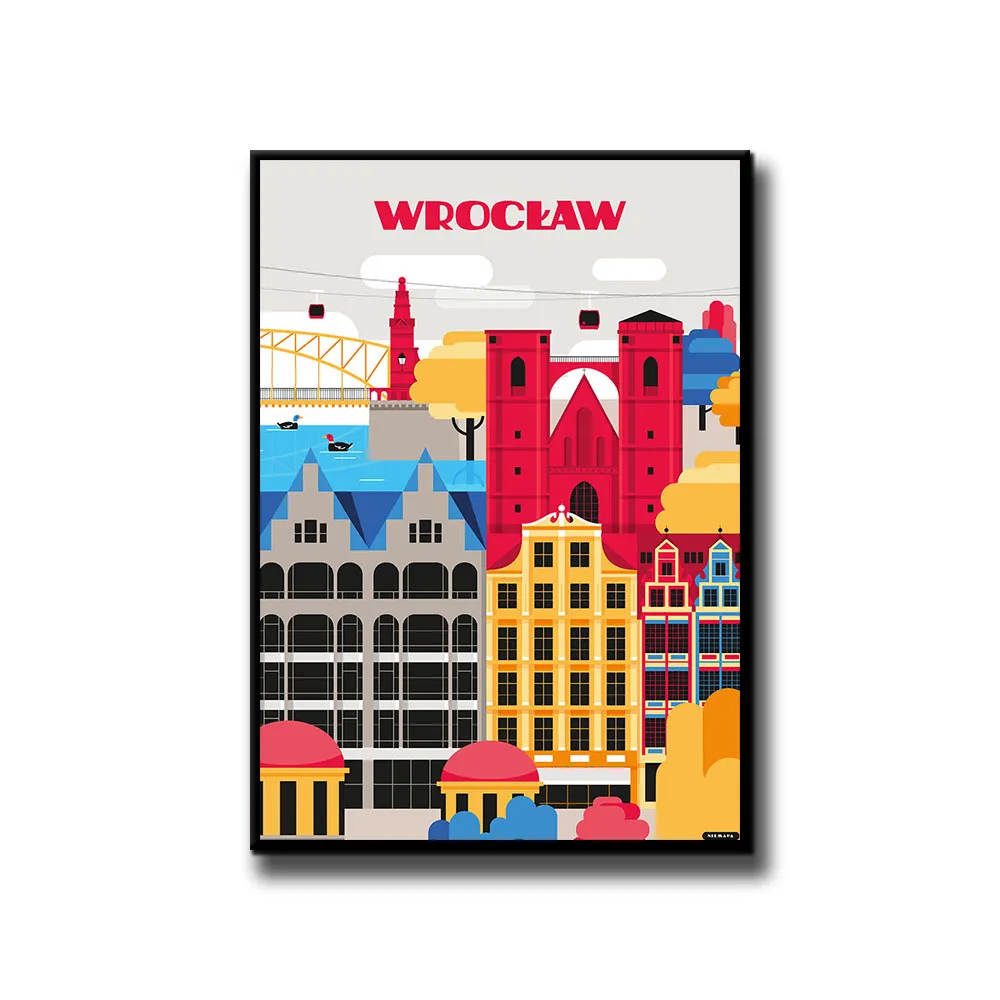 Plakat Wrocław grupy NIEMAPA to inne spojrzenie na Twoje miasto i otaczającą Cię okolicę. Przyjemna kreska, kształty i kolory sprawiają, że plakat od razu rzuca się w oczy i nie przechodzisz obok niego obojętnie. Znajdziesz tu charakterystyczne miejsca Twojej okolicy, przedstawione w nieco inny, taki NIEMAPowy sposób.